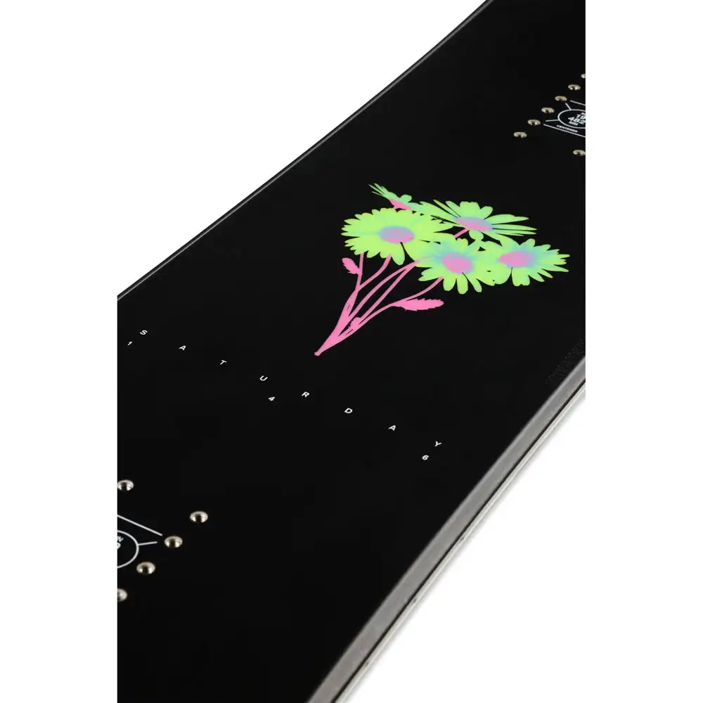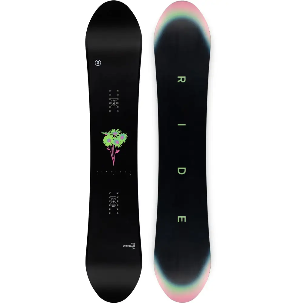 The Saturday is a twin shape at home anywhere on the mountain. The standard camber profile provides a camber between your bindings for snap and control and a rocker at the tip and tail for catch-free riding and float. A Quadratic Sidecut improves turn initiation and exit as well as edge grip. Slimewalls provide a smooth ride and increase durability by absorbing impact. Carbon Array 3 provides extra pop and control without adding stiffness. The Ride Saturday is a mid-flexing twin built for intermediate to advanced riders that want one board for all conditions.
